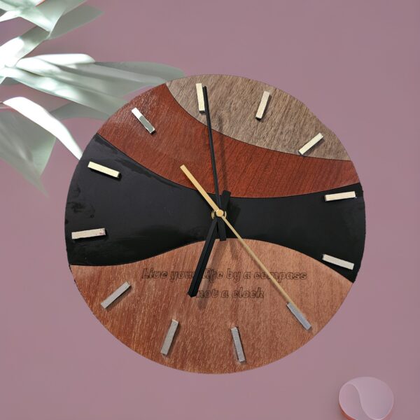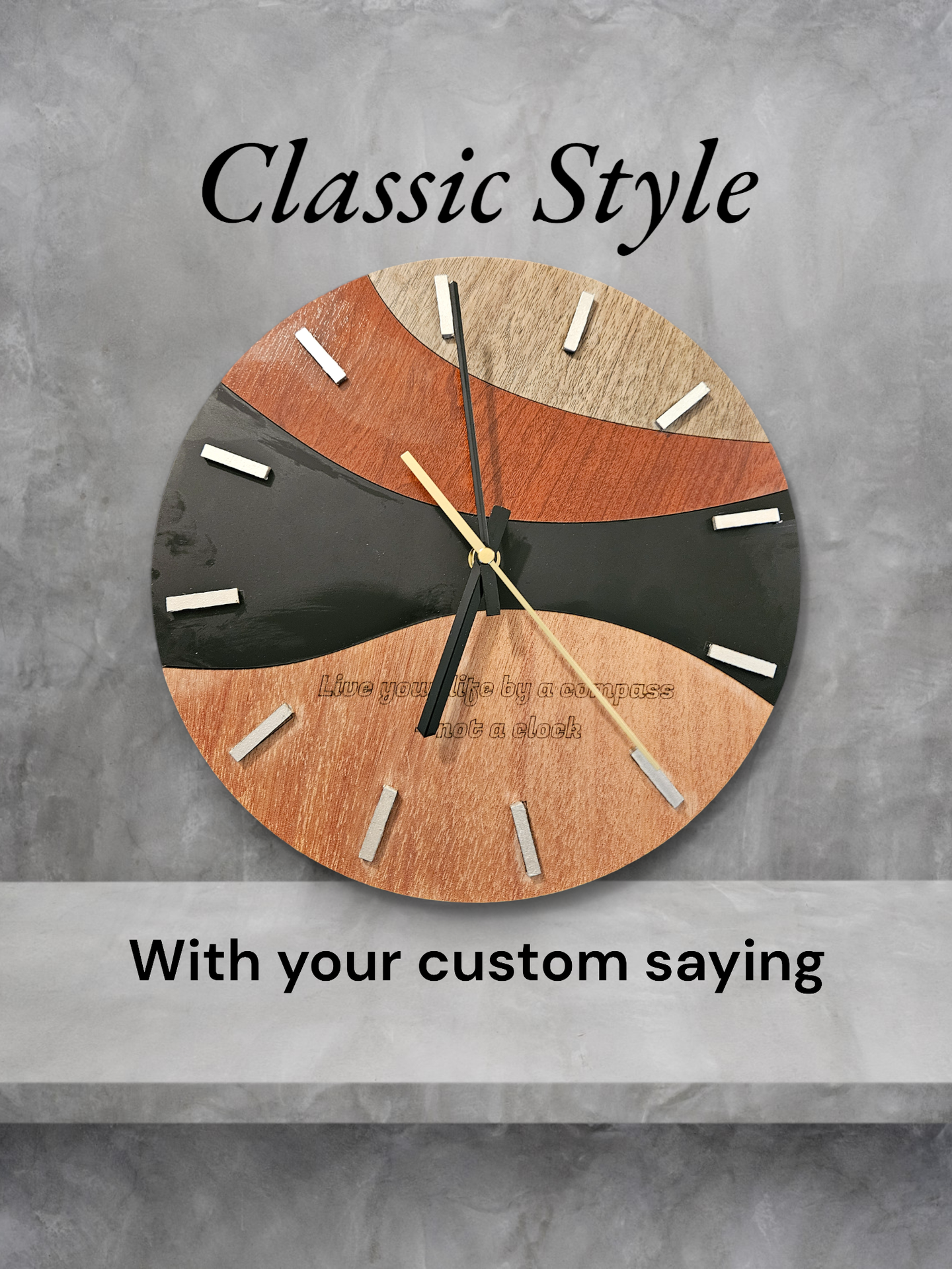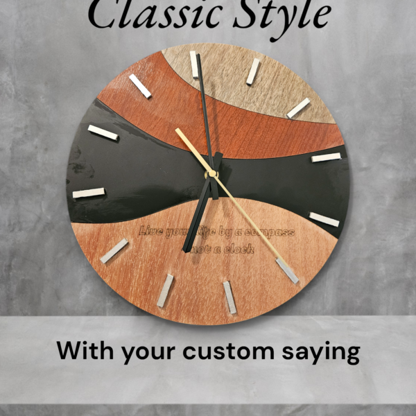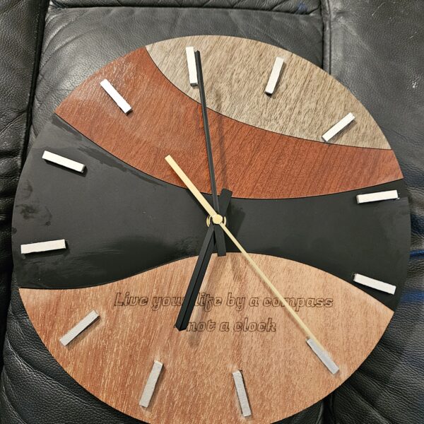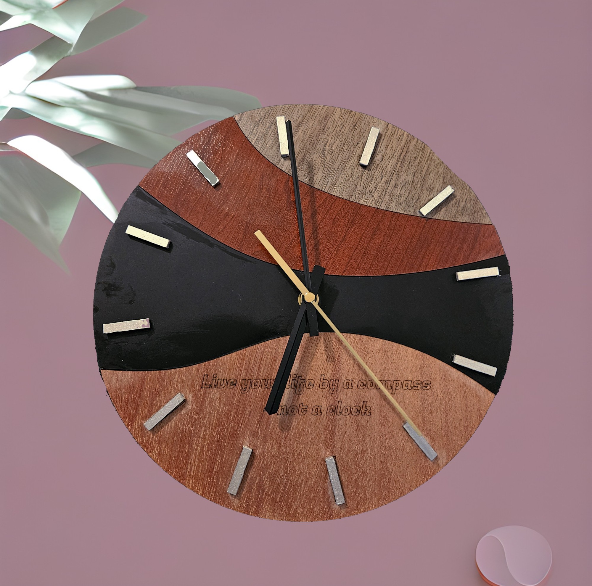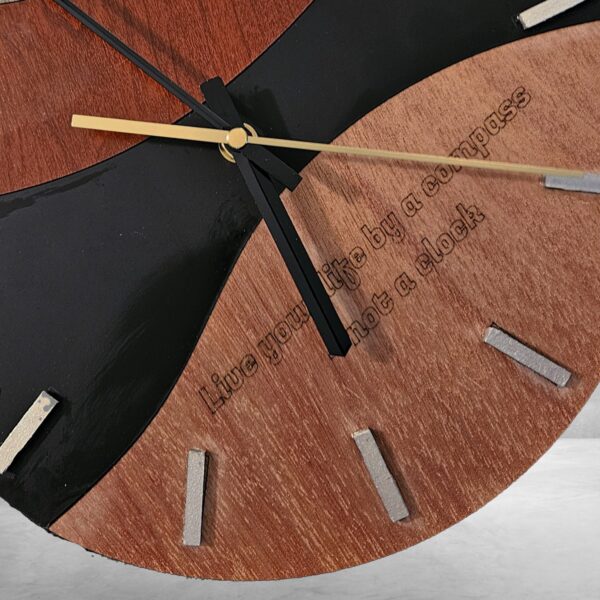 | Introducing our artisan-crafted wood clock, a masterpiece of elegance and wisdom. Made from three distinct woods, each chosen for its unique grain and character, this clock not only tells time but also inspires with its engraved mantra: “Live your life by a compass, not a clock.”