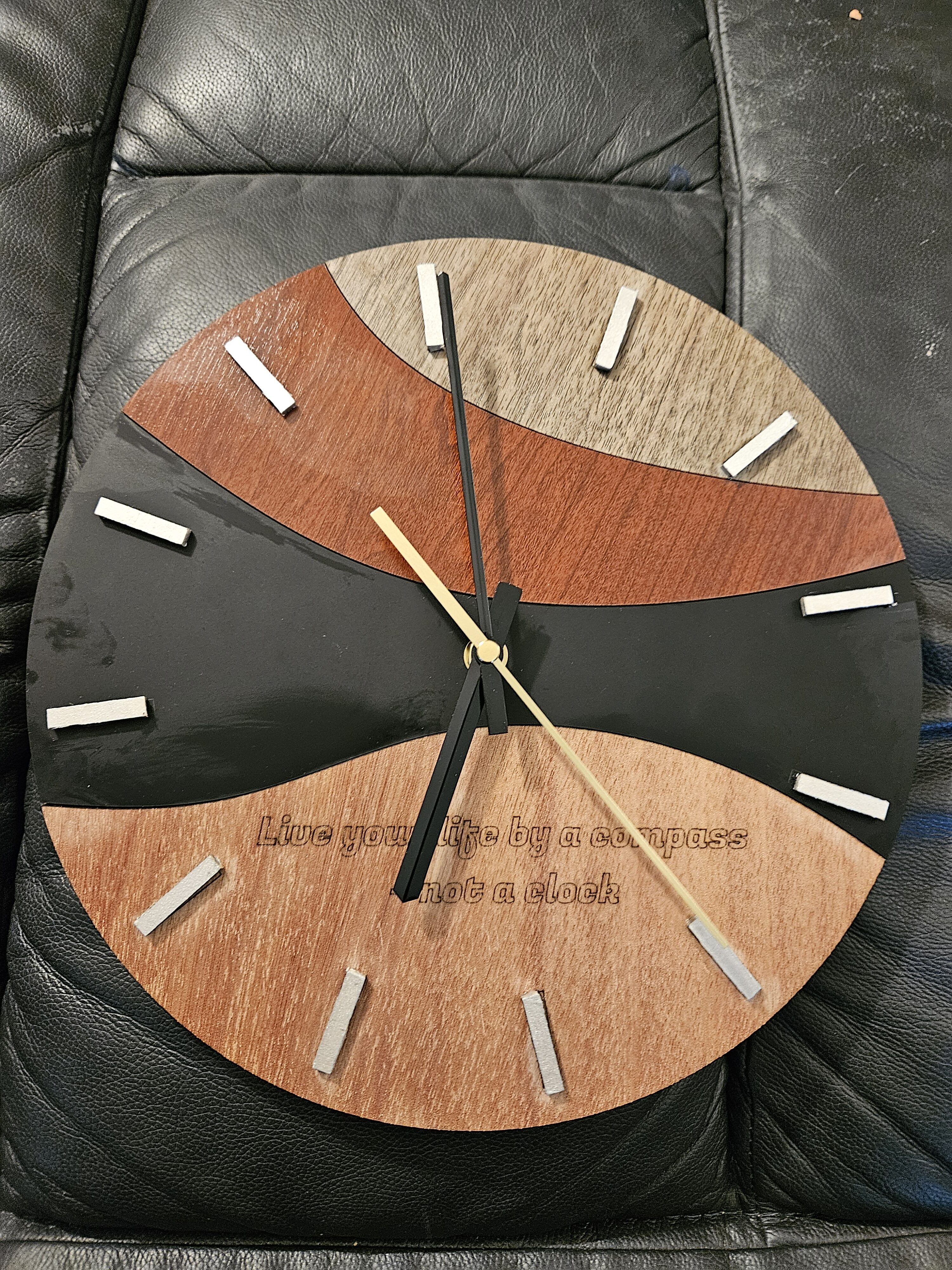 Embodying the spirit of adventure and purpose, our clock is more than just a timepiece – it’s a daily reminder to navigate life with intention and direction. The rich, natural hues of walnut, mahogany, and cherry blend harmoniously, creating a striking contrast with the black plexi that complements any space. You can customze the engraving with a saying or a name/names.