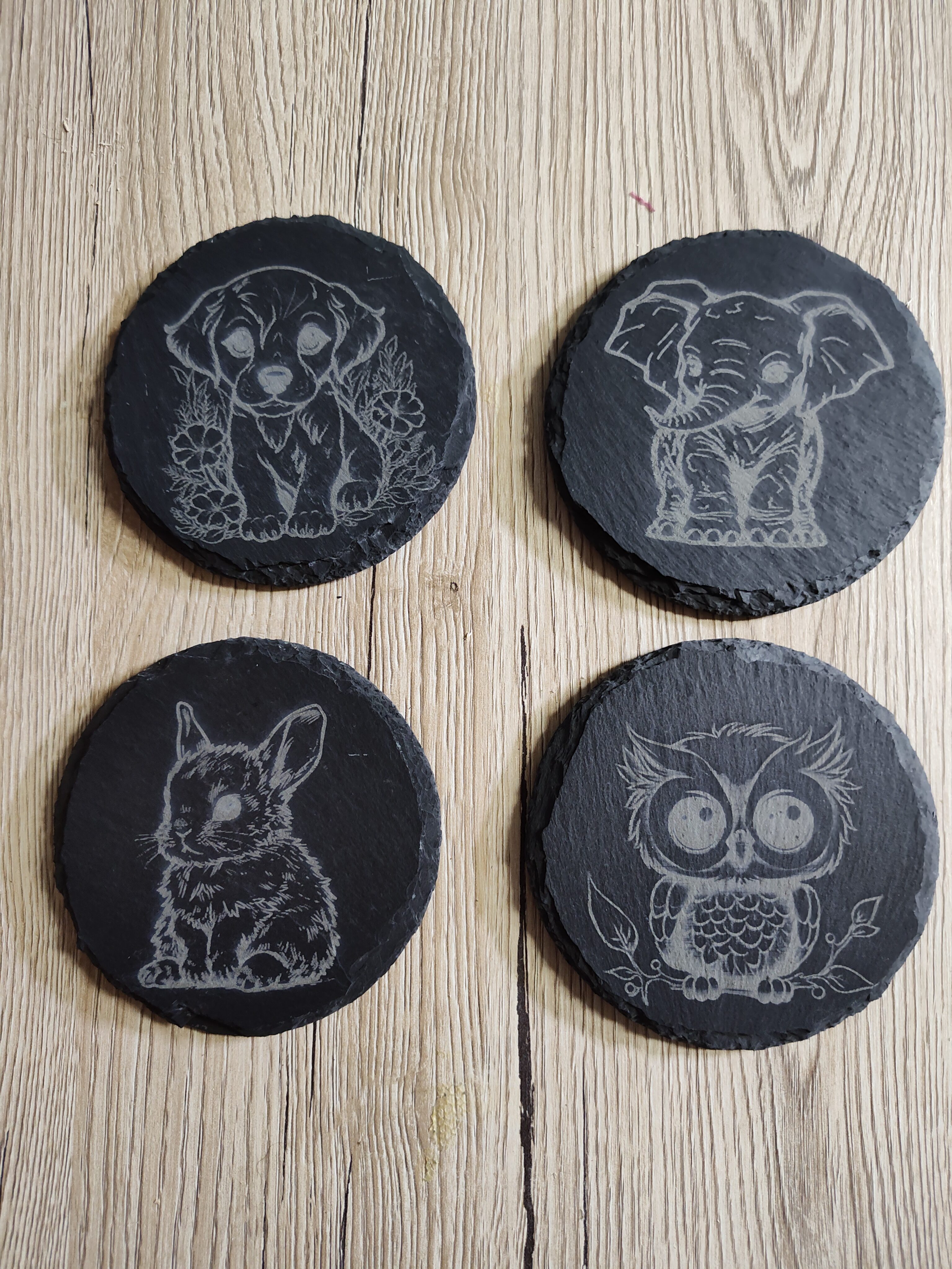 Discover the charm of our adorable 3-inch black slate coasters, beautifully engraved with cute baby animals. Perfect for adding a touch of whimsy to your home decor or gifting to someone special, these coasters blend natural elegance with irresistible cuteness. Crafted from high-quality slate, each coaster features a unique engraving of a baby animal, making every piece a delightful addition to any coffee table or kitchen counter. Equipped with rubber feet to protect your fine furniture. Whether you’re enjoying a relaxing cup of tea or entertaining guests, our set of 4 baby animal engraved slate coasters promise to bring joy and style to any occasion. Treat yourself or surprise a loved one with these charming coasters that capture the innocence and beauty of nature’s little wonders.