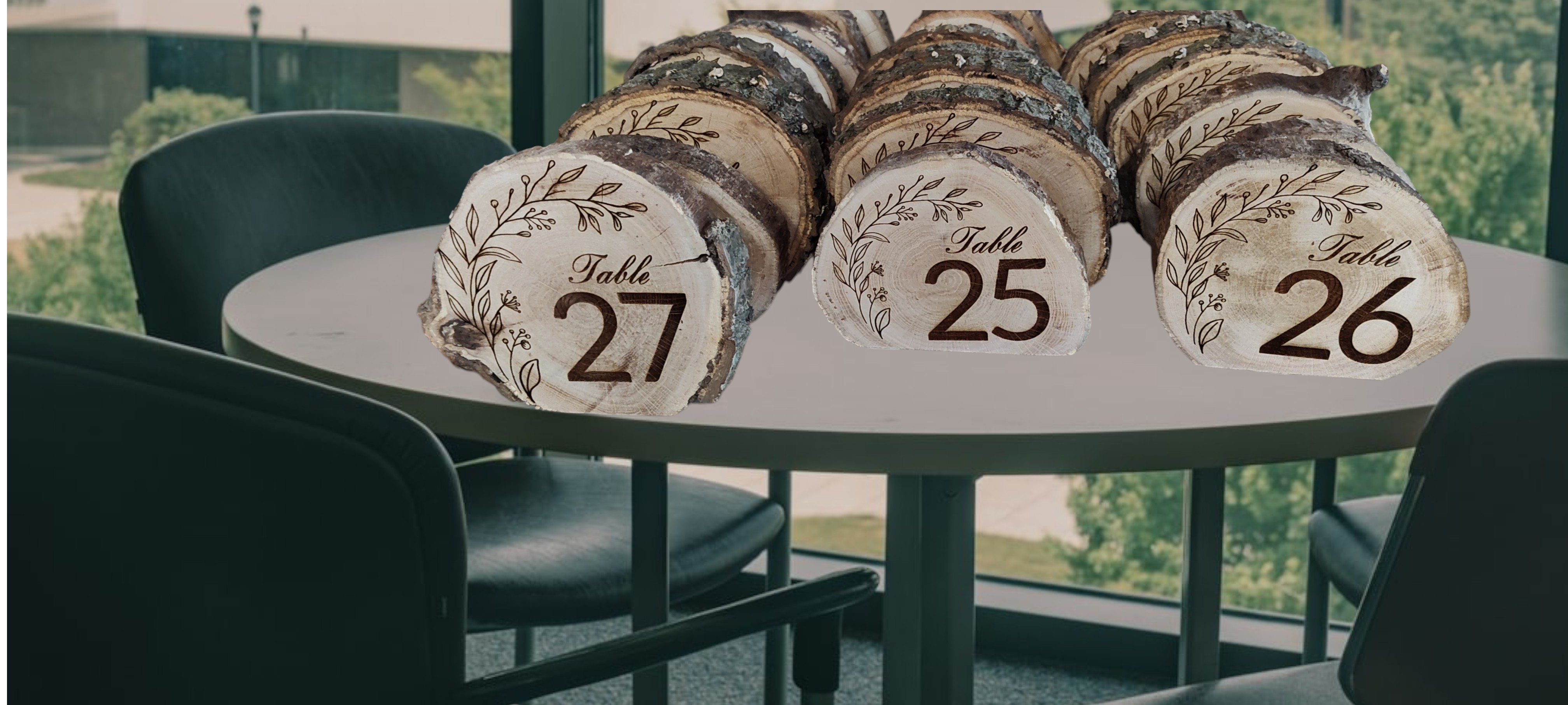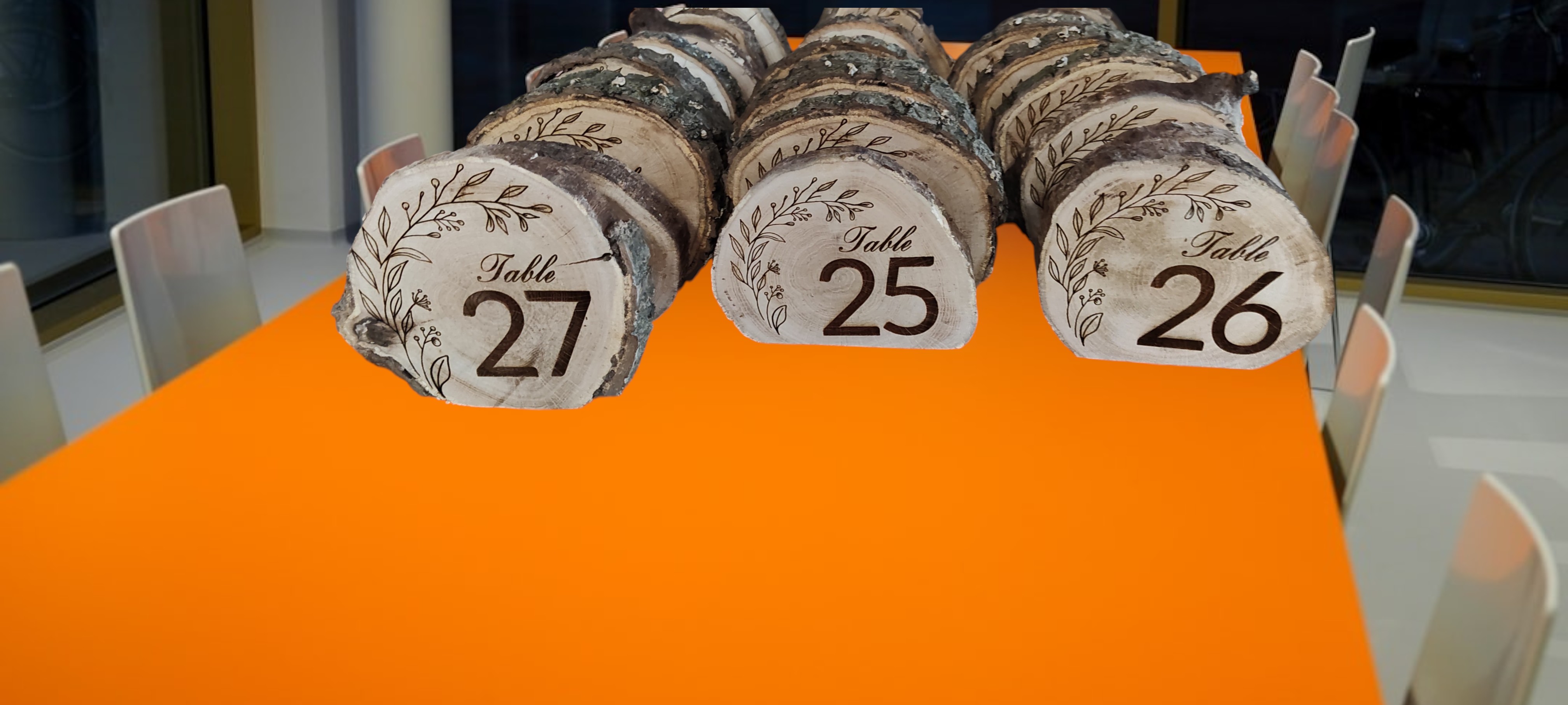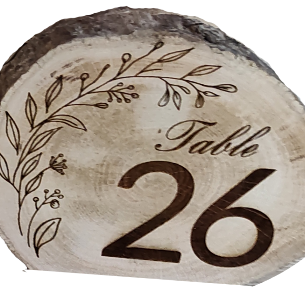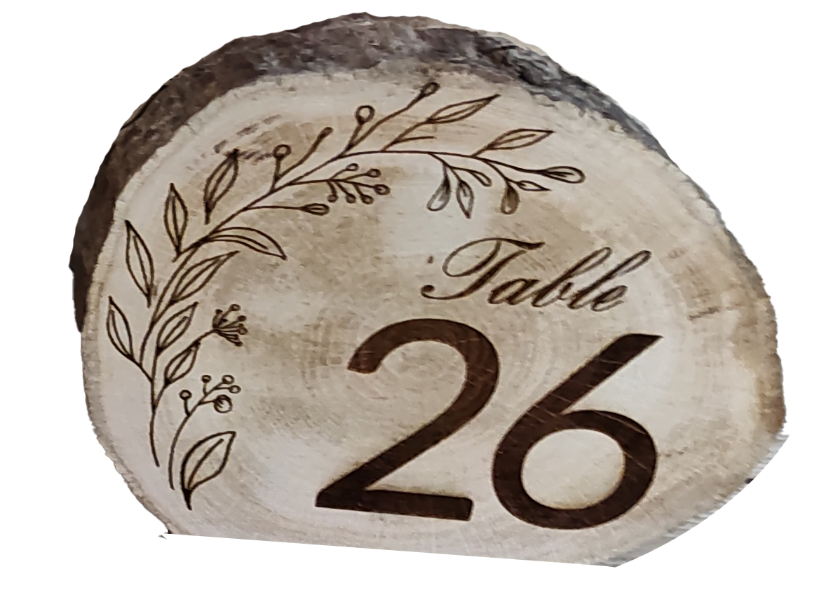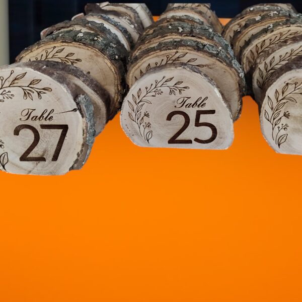 No two disks are the same, offering beautiful variations in grain, color, and shape that make each table number truly one-of-a-kind. The engraved numbers are bold and elegant, ensuring guests can easily find their seats while adding a thoughtful visual element to your table settings.